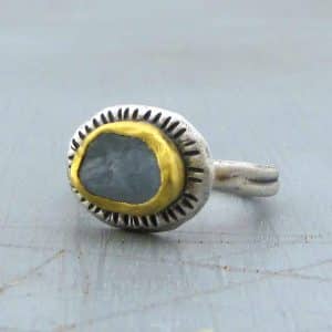 טבעת כפרית עם אקוומרין גולמית, זהב 24 קראט וכסף.