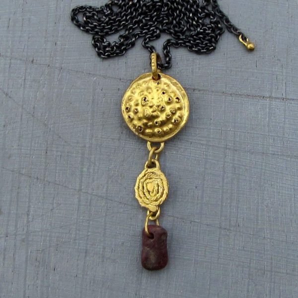 This exquisite piece jewelry combines traditional craftsmanship with timeless elegance. The pendant is made of hammered 22 karat gold and has a unique texture with a dangling raw ruby bead.